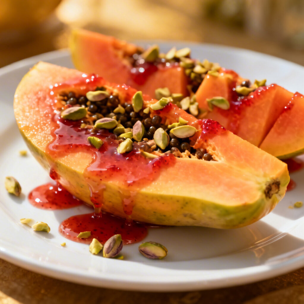 Papaya en culís de frutilla salpicada con pistachos (4 porciones)