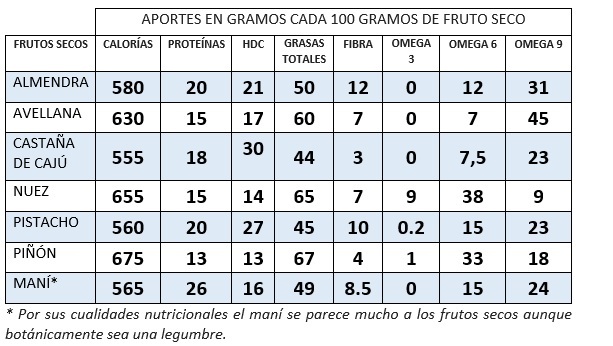 Todos los frutos secos aportan hidratos de carbono de absorción lenta (los más convenientes), proteínas incompletas y grasas buenas (omega 3 y 9). También son ricos en fibra, vitamina E, magnesio, arginina (aminoácido con propiedades vasodilatadoras) y fitoquímicos.