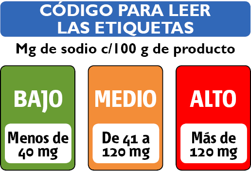 2. Leé las etiquetas y preferí alimentos que indiquen “reducido en sodio”, “bajo en sodio” o “sin sodio agregado”. Los productos contienen sodio cuando en la etiqueta dice ciclamato de sodio, glutamato de sodio, bicarbonato de sodio, citrato de sodio, sacarina sódica, etc.